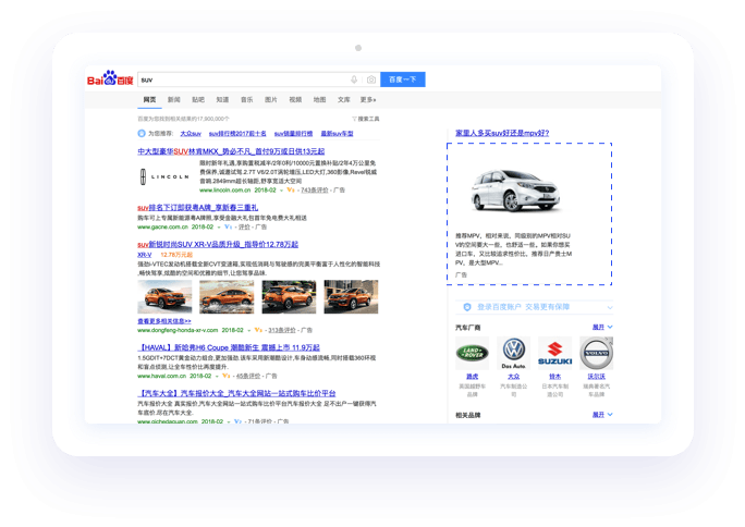 您可以在用戶興趣階段,通過在搜索結果頁右側強勢展現品牌廣告,增加品牌露出。